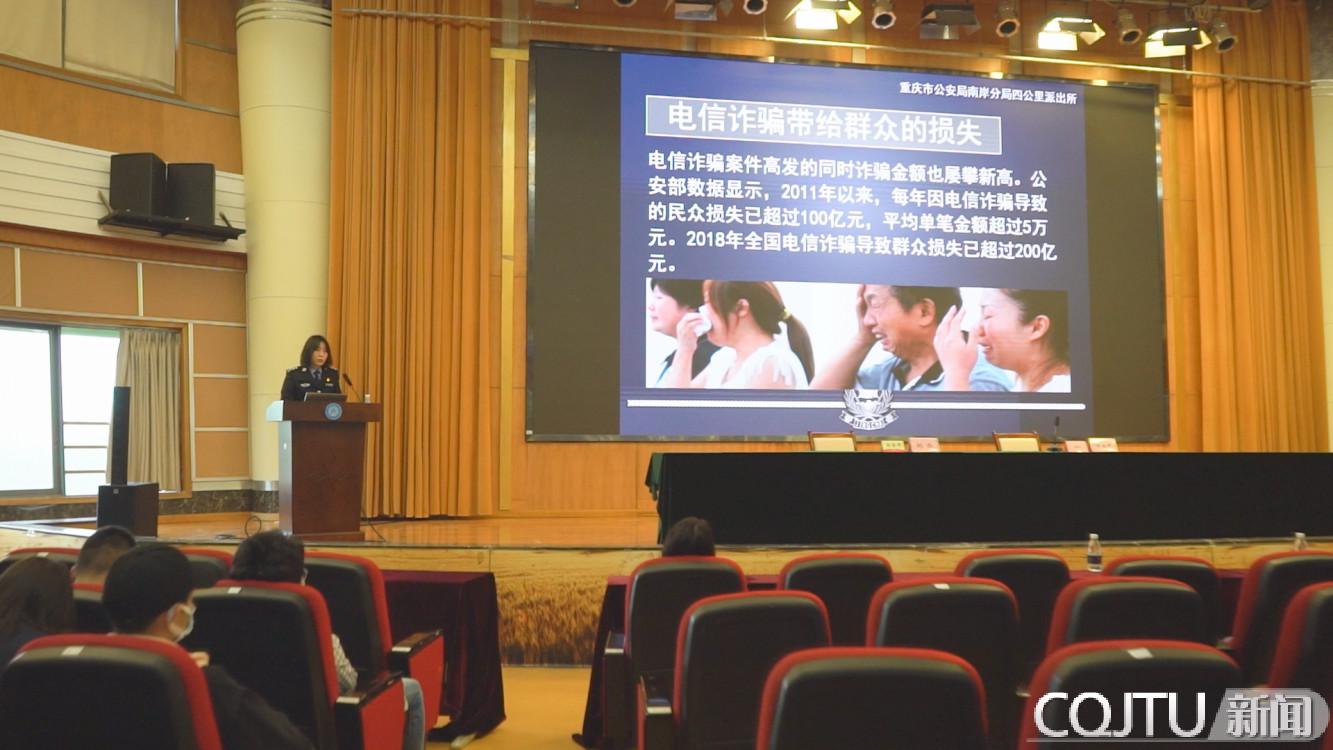 在南岸校区举办的安全讲座,由安全管理处副处长黄廷强主持,邀请南岸区公安分局四公里派出所警官赵细妹为师生作反诈专题宣讲,赵警官就冒充公检法人员、邮政人员、银行卡升级、裸聊、短信诈骗等手段,为广大师生详细讲解了目前高校师生高频发生的真实诈骗案例,进一步提高师生在日常生活中防电信诈骗的意识。